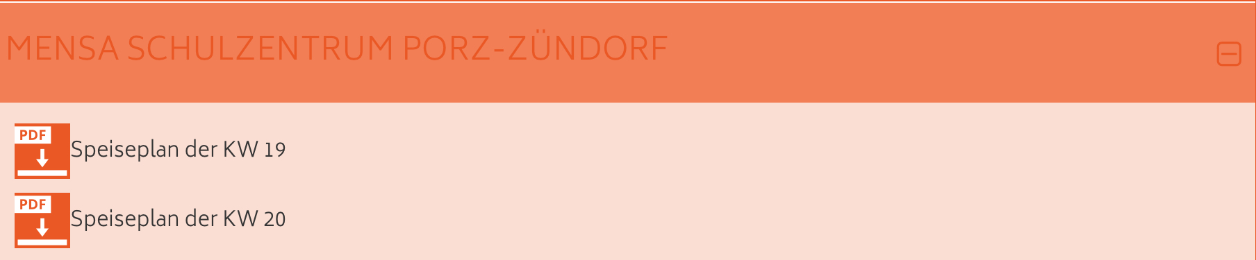 Der jeweils aktuelle Speiseplan kann über die MOHRrübchen-Homepage (unter Mensa Schulzentrum Porz-Zündorf) eingesehen werden: